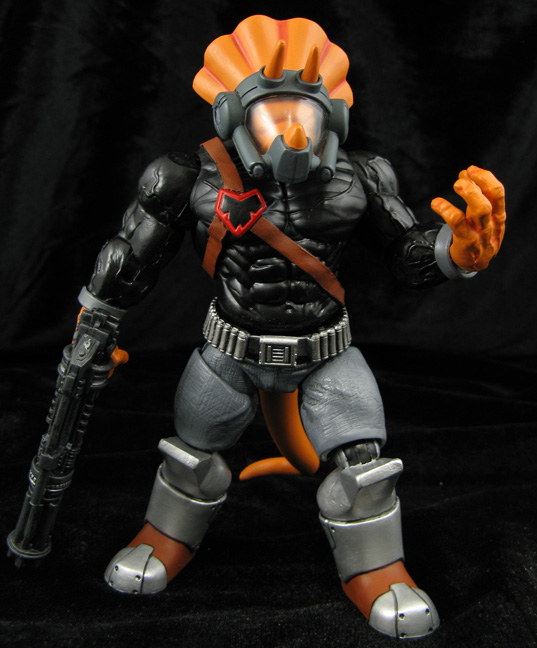 The Triceratons in the Teenage Mutant Ninja Turtles comics are some pretty tough customers. They've appeared in the cartoons as well and this time I took a crack at a combined look. The Triceraton was created using the 2009 Triceraton head and tail, a movie Hulk 5" body, and the lower legs from a Redakai figure. I used real leather straps for the Triceraton's bandoleer and affixed his symbol, crafted a belt, and other details from fodder parts. A couple deadly weapons were added and the Triceraton was ready to cause havoc for the Turtles!