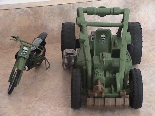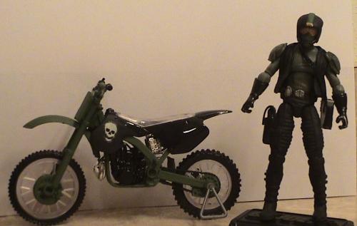 Still using up what I have around I created this character: Trailblazer. I see him as an Ex-Dreadnok turned Joe. He did a few years in the Marines but was discharged for taking military vehicles for joyrides in enemy territory. After discharge he traveled the world competeing in many extreme sports. Some of these were Moto-Cross, Extreme Marathons, Survival Drops and Dune Buggy Racing. During a stay in Australia he entered one of the Dreadnok recruit drives and burried the competetion. He quickly developed strong feelings for Zanya and disgust for all things Dreadnok. He tried to get her to leave and go with him, but she refused. He joined the Joes to try and make up for his past and with the intent of saving Zanya from herself. He is one of the Joes primary insertion members in unmapped territories. He drives his Buggy till he can't go any further, then pull off his bike and gain some more ground. After that he'll make his way on foot till he gets to the target.