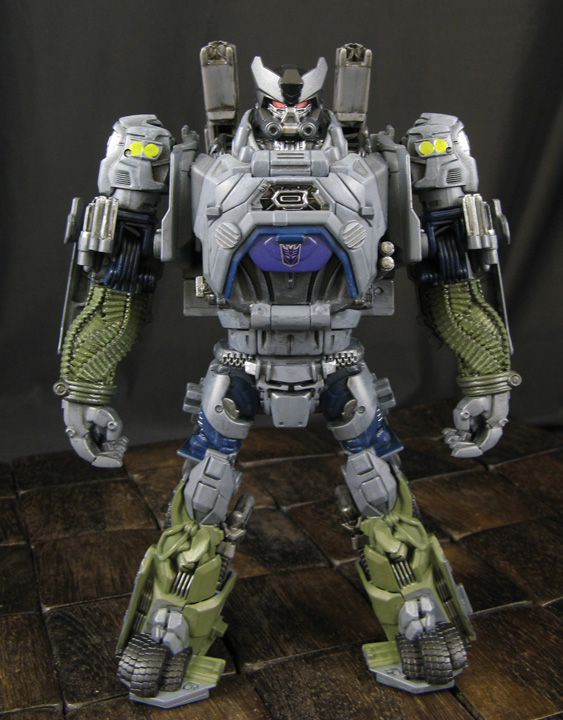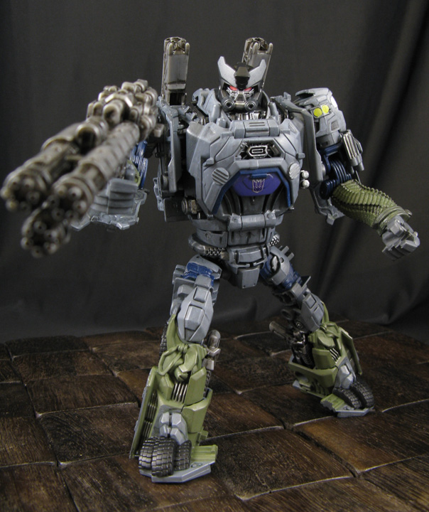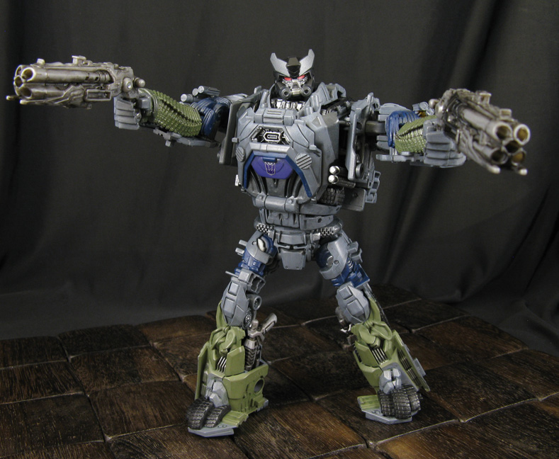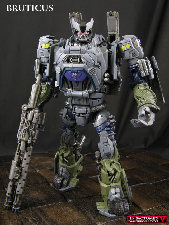 Rumbling towards battle comes the powerful Decepticon Bruticus! This time he's been re imagined in the Age of Extinction style instead of his usual combiner form seeing as Brawl bit it in the first movie anyway. Bruticus was made from the incredibly versatile Hound voyager mold, modded Dead End head, and some extra fodder bits. His hand-guards were made to be detachable and his entire body hand painted and weathered for a military look including his weapons. This Bruticus is ready to take on the entire Autobot team now!