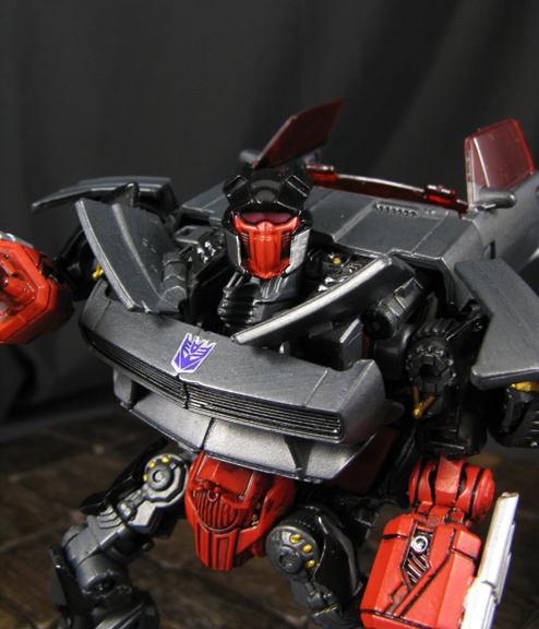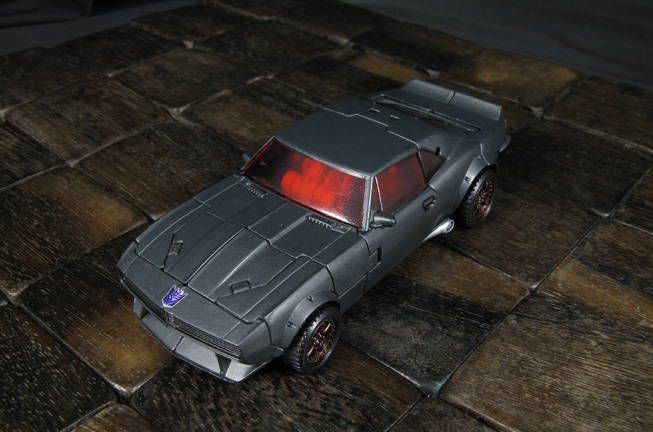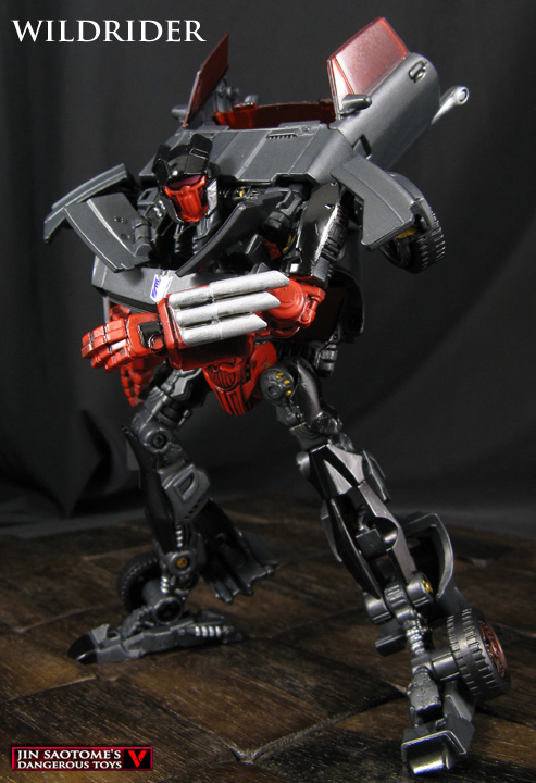 The Stunticons are a crazy bunch of Decepticons that love to wreck it on the road. Here's Wildrider, the gunmetal-black colored muscle car. Since there really aren't combiners in the movies he's a standalone character created from the new AoE Bumblebee, FOC Roadbuster arms, and Dropkick head. He was given an alternate chest/arm transformation and nifty clear red windows. Ready form some Decepticon action? Wildrider is at your service.