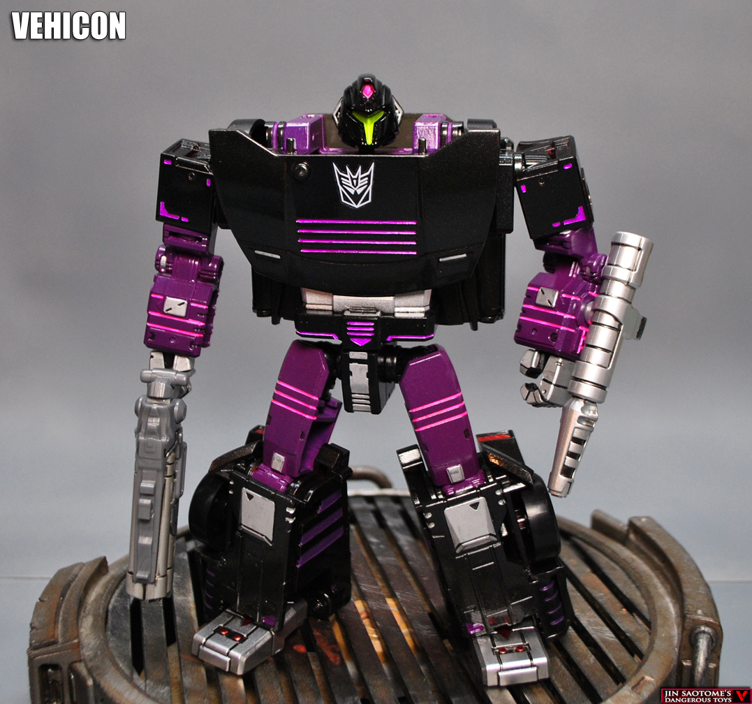 He's finished, a Siege style Vehicon based off the Decepticon Brute/Drone from War for Cybertron game. Vehicon was made from an upscaled Sideswipe KO, modded Dinobot ConstructBots Strafe head, and some movie Hound weapons. He was primered with Bulldog Adhesion promoter and painted using Tamiya/Testors lacquers and neon paint detailing that shows up great under a black light. Vehicon's paint job is metallic black with Mr Hobby premium gloss sealer.