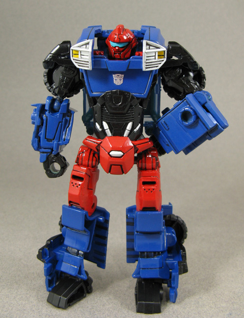If you had any G2 Transformers you may have owned the smaller Matchbox sized 'Spy Changers'. Motormouth is from the Go-Bots series similar these and here I've customized a Deluxe version of the blue pickup. Motormouth was created from a Transformers Prime Kup body and Power Core Combiner modded Double Clutch head. Some Bot-Shots sawblades from a Ironhide with trailer deluxe set were given 5mm silly-straw posts so they could plug into his forearms. He was basecoated with Testores Model Master Acryl royal blue/red then sealed with Testors One Coat Lacquer 'Clear wet look' spray. Now he's ready to mouth off to the Decepticons in battle!