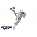 Road Rage is very faithful to her original her colors - though strangely enough, she also appears to be taking some inspiration from her Animated incarnation with her white biceps and thighs. Her alt-mode, apart from presumably the colors, appears identical to Tracks', although it seems she may lack the shiny paintjob Tracks features. As for her accessories, she will come with a mini Twincast boombox - the rebuilt form of Blaster (AKA Billy). UPDATE: Courtesy of Autobase Aichi, we have a couple of better images. Get your preorders in here, and make the jump to take a look at the new pics! • BigBadToyStore • RobotKingdom • TFsource |