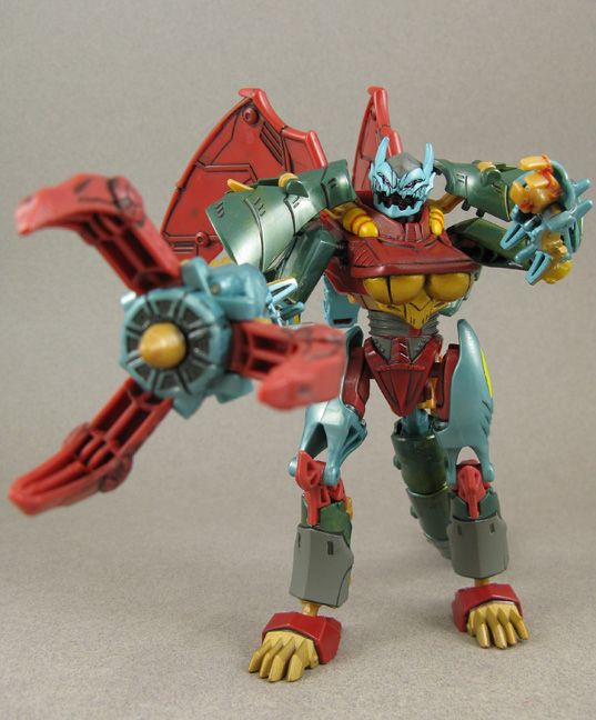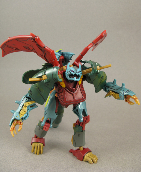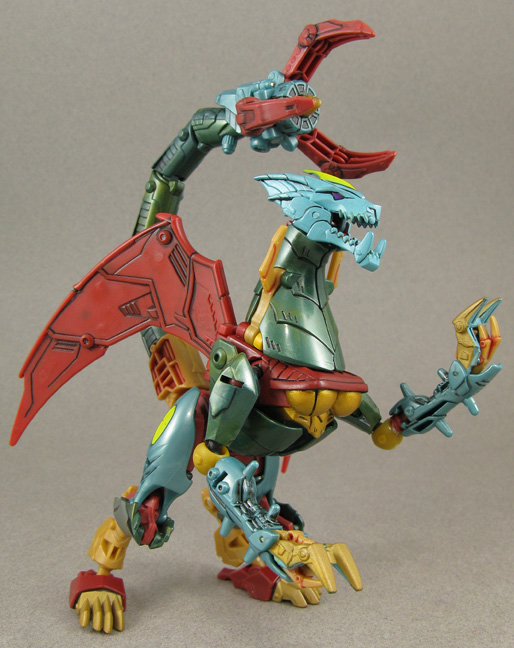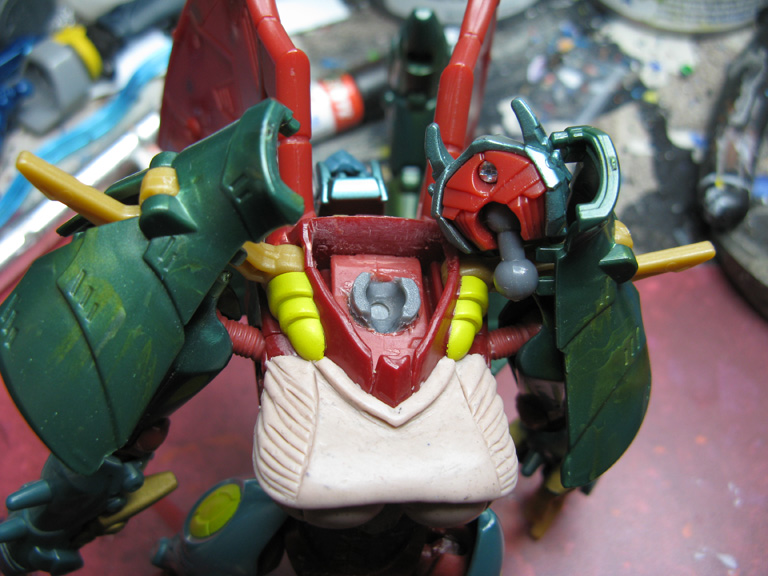 This Transformers Prime custom Beast Hunters Ripclaw features two easy to do mods and one not so easy to do. Her neck mod involves buying a set of the double ball joints from Big Bad Toy Store and removing her old one, drilling down into the neck piece so you can glue in the ball cup. The other ball post end snaps perfectly in her head socket. For her ball-jointed elbows I used TF Movie Depthchage's elbows, cutting the originals off at the red swivel peg and drilling into that to mount the gold ball cups. While Ripclaw's bio mentions the character is a 'She' there's still argument in the Transformers fandom. Here I went to put an end to that buy sculpting a brand new chest plate to show off her new assets. They don't get in the way of her Transformation and with the additional mods she can look in any direction and put her claws on her hips! Some panel lining, shading, and recoloring of her head and this shapely fembot dragon was ready for battle.