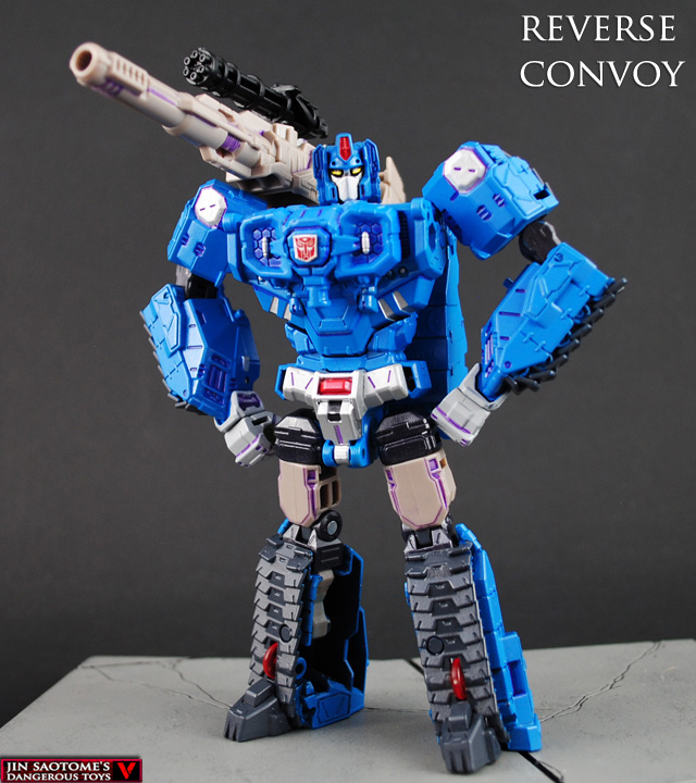 Is he friend or foe? Autobot or Decepticon? It's your choice with my custom Reverse Convoy! Here's a Transformers dual-headmaster based on the Titans Return line. He was crated using the deluxe Hard head mold, modded voyager deluxe Megatron face, deluxe Robot Masters Prime face, and some additional fodder parts for the chest. He has a magnetic dual-sided symbol that you flip around for Autobot or Decepticon and his Headmasters can both sit in the gun and cockpit in tank alt mode. Reverse Convoy was painted with Tamiaya spray lacquers and Testors Aztek airbrush paints.