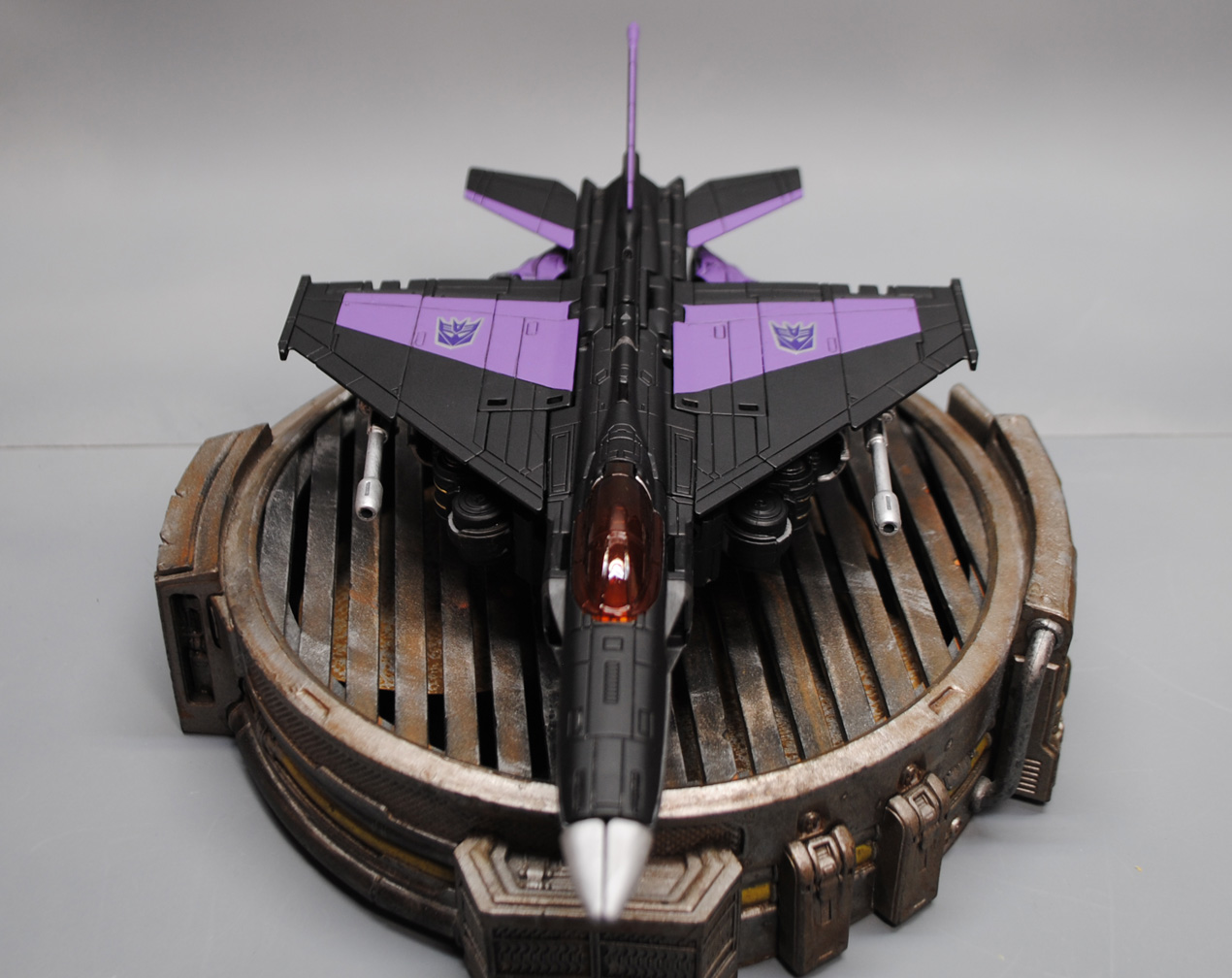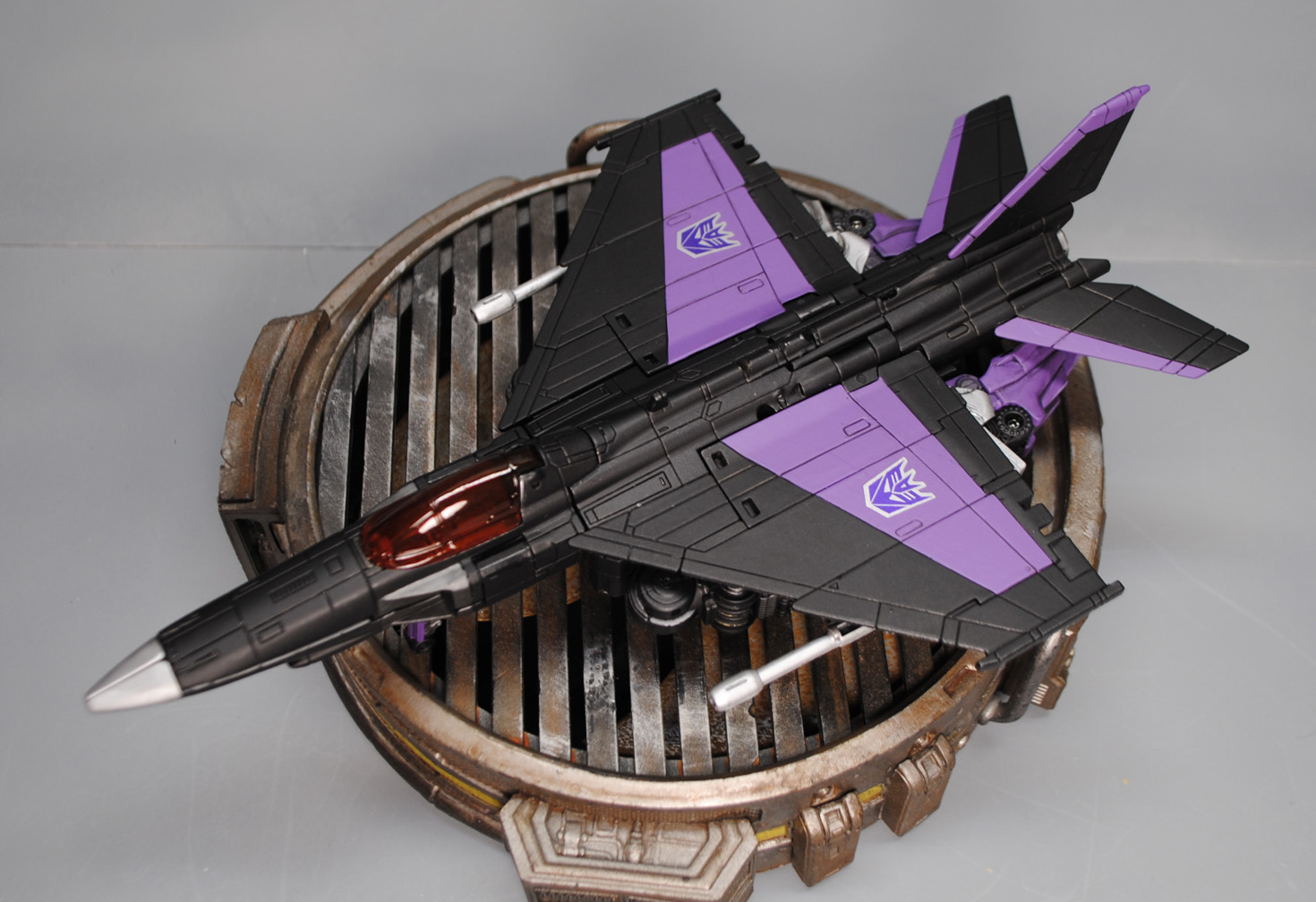 This week I've created Skywarp in Bumblebee-movie-syle similar to the Starscream I made earlier. The body is a Nitro Zeus/KSI Boss mold and a Shapeways shop Ariel's Customs Seeker faceplate on a Titans Return headmaster. I shortened the kneeplates, added toes, and swapped out the neck gatling guns/wrist cannon for different blaster tips to differentiate him from Starscream. Skywarp was primered with Bulldog (or Duplicolor) Automotive Adhesion Promoter, painted with Testors Metalizer and Aztek Airbrush paints, and sealed with Mr Hobby Premium flat/gloss spray sealer for a factory finished look. He transforms the same and the headmaster can fly in the cockpit!