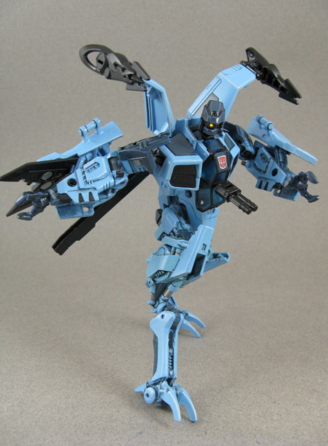 Whirl is one unstable and dangerous Autobot as he's portrayed in the comics and I decided to recreate him IDW style. Here I used a Generations Springer mold and modded it with movie Ravage lower legs, an armored core head, Kre-O scorponok claws, and c-clip weapons. The claws instead of hands really work well to distinguish Whirl as do his new bird-like lower legs. The front gun can be pegged underneath when you transform him and the c-clip weapons can be folded against his forearms or placed on his wings. One comic-style paint job and semigloss seal later he was ready to...uh...whirl into action!