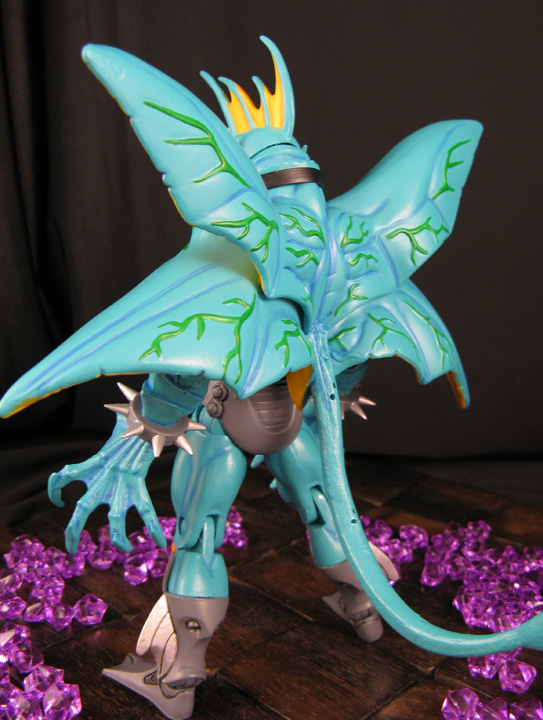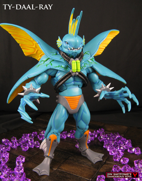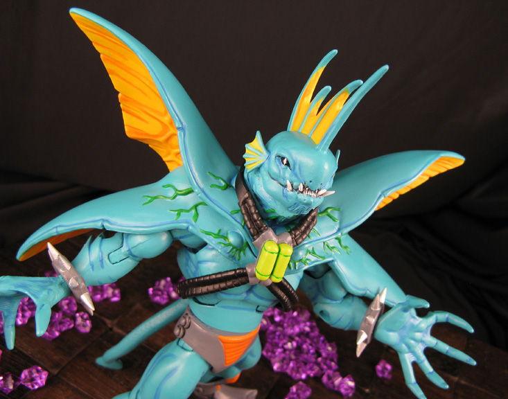 Deep beneath Eternia lies a vast expanse of subterranean rivers and oceans protected by the heroic Ty-Daal-Ray. Nicknamed 'Tidal Rave' by his allies because of his wild colored fins This aquatic warrior knows every delta and shore of Subternia's waterways and is ready to defend them against any foe. Ty-Daal-Ray was created using a stock MOTUC body, modded halo 4 Grunt head, Ben 10 Highbreed vinyl figure upper wing set, Hydron lower legs, Man-E-Faces codpiece/chest hose, toybiz Venom Phage hands, and Prometheus Trilobite tentacle tail. Getting the parts to fit together was challenging as was blending the sculpt together but I'm thrilled with the finished product. One sea-inspired paint job later and Ty-Daal-Ray is ready to battle evil wherever the tides take him!