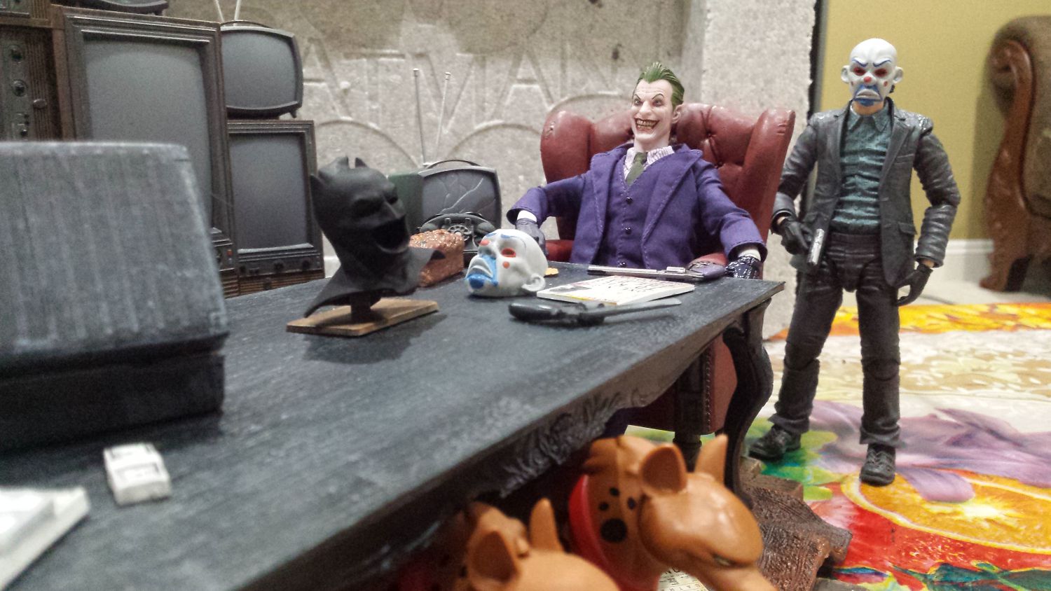 Thankyou guys..yeah..i never knew abt the origins statue..but the day i saw it..i knew my mezco joker was gonna be there.. took some effort to pull the other joker out of the base. But it looks amazing after i got the mcfarlane chair from morpheus set..even got a little telephone with it. M just looking for a hat for joker..ive ordered one from 1989 joker by toybiz..gonna have to see how it looks n how much i have to work on it. The hyenas are from aninated series joker(new one). Thanks for your comments. Oh yes I even used mafex joker's hands for the mezco joker!