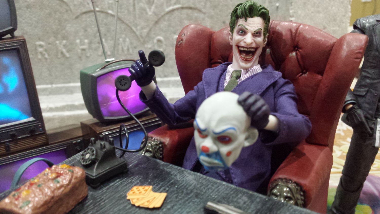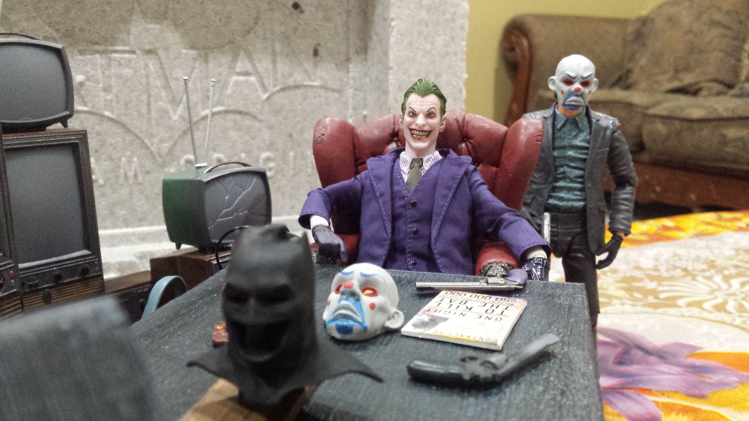 Thankyou guys..yeah..i never knew abt the origins statue..but the day i saw it..i knew my mezco joker was gonna be there.. took some effort to pull the other joker out of the base. But it looks amazing after i got the mcfarlane chair from morpheus set..even got a little telephone with it. M just looking for a hat for joker..ive ordered one from 1989 joker by toybiz..gonna have to see how it looks n how much i have to work on it. The hyenas are from aninated series joker(new one). Thanks for your comments. Oh yes I even used mafex joker's hands for the mezco joker!