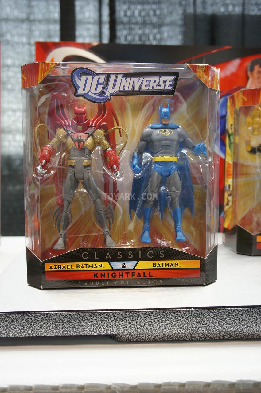 Feast your eyes on the next series of DCUC 2-packs, slated for release this year! Fully revealed at Toy Fair this weekend, Knightfall consists of Batman (Battle Damage) and a repainted Azrael Batman. Sinestro Corps Hal Jordan and Blue Lantern Kyle Rayner make up the second 2-pack, War of the Green Lanterns.