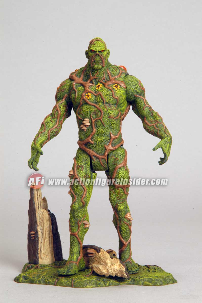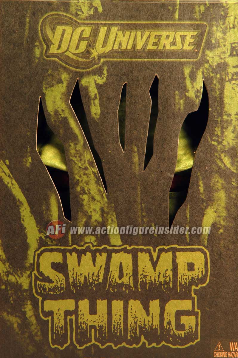 Featuring endoskeletal articulation (the first of its kind), Swamp Thing comes packaged in a paper pulp mold of a Swamp Thing head and houses Swamp Thing himself! No ordinary packaging can contain Swamp Thing, so he’ll be packed in a shipper box with the Swamp Thing head peering out.
