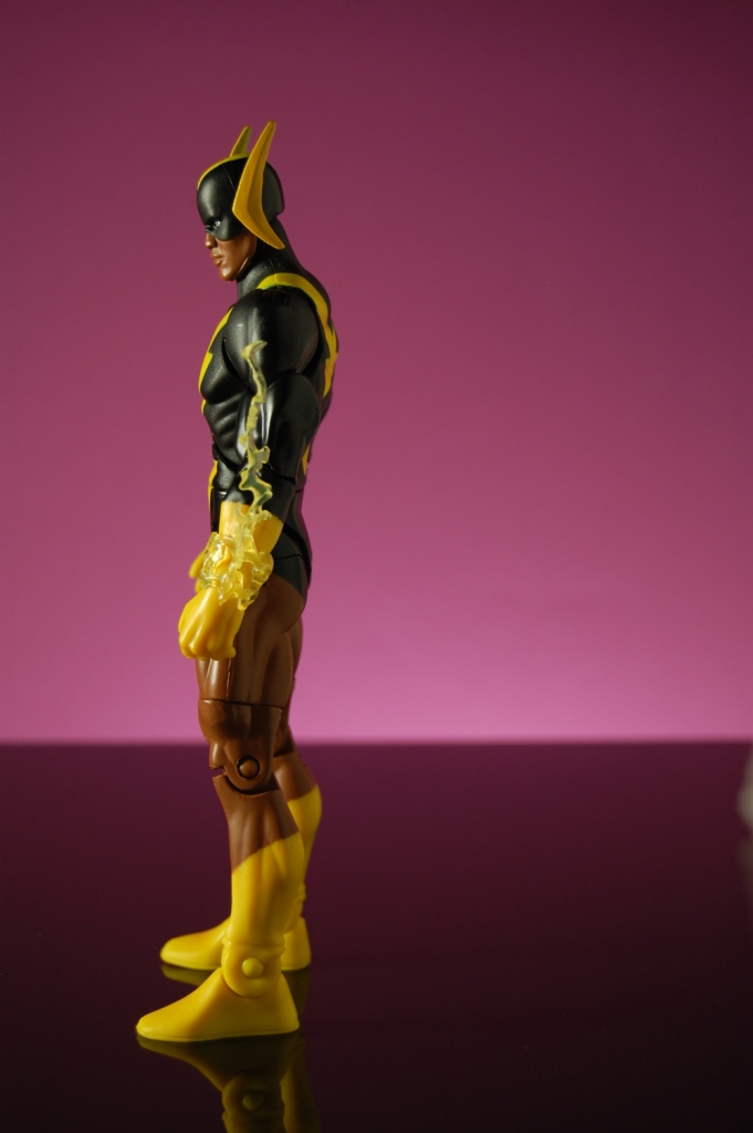 By way of accessories, Black Vulcan comes complete with two clip on electricity effects and Collect and Connect Apache’s Chief’s right leg. The effects seem to be recolored versions of those that came with Superman (Red/Blue), just recast in clear, yellow plastic. To me, these look awesome, and just add something cool to this Super Friends member. The only new part on this figure, sculpt wise, appears to be the head, but it's spot on to his cartoon counterpart. Black Vulcan has the usual DCUC articulation with a ball jointed neck; swivel hinged shoulders and thighs; bicep, thigh and wrist swivels; and single elbow, ab, ankle and knee hinges and nothing appears to be hindered. Paint appears to be good, for the most part. Around the yellow chest symbol, as is to be expected, the paint can get a little dodgy, but other than that, it's well applied and the metallic yellow on the mask ears is a nice touch. Another small point is that the V-neck collar has been removed in favor of a closed costume neck line. Yeah, the original character had a V-neck, but this looks just as good to me. So, final thought wise, Vulcan has really warmed me over. He's got cool accessories and a nice sculpt and paint, so unlike El Dorado, I'll be adding this Super Friends member to my DCUC collection as soon as the wave hits retail. Enjoy the attached photos, supplied by our friends over at TheFwoosh!