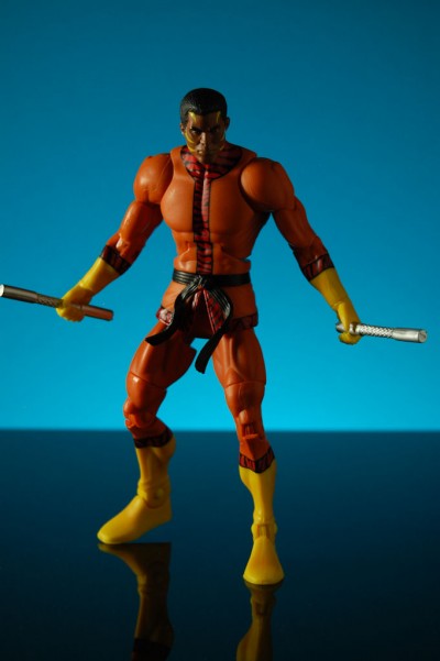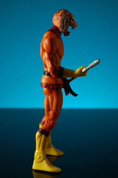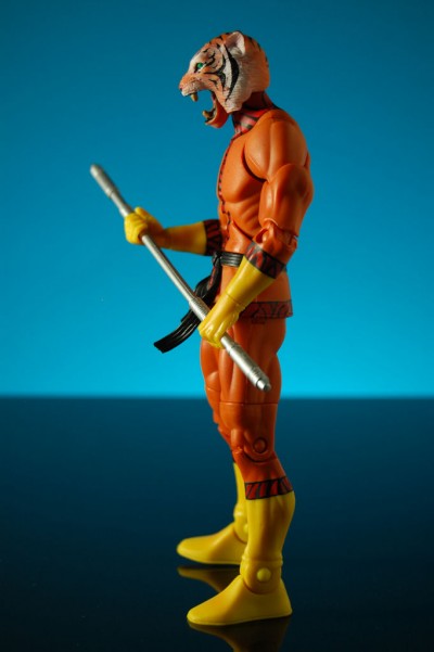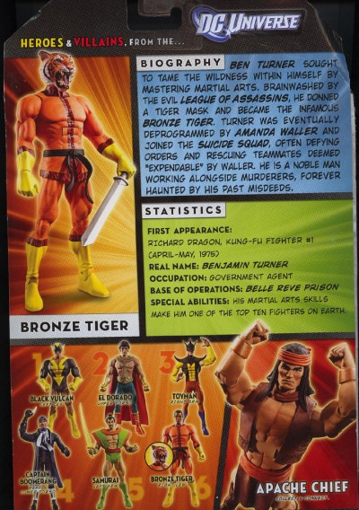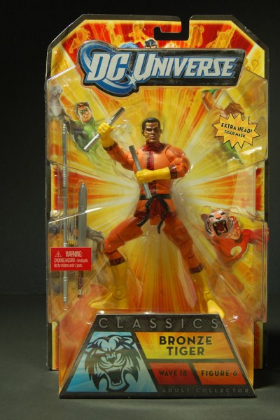 In the accessories department, aside for a piece for C&C Apache Chief, Tiger also comes with a tiger mask and a small grouping of reused DCUC weapons, including Deathstroke’s sword and staff as well as Nightwing’s Tonfa sticks. They're a nice inclusion with the figure, as many DCUC figures don't even come with accessories in many cases. They fit the character well, even though he was more of a hand-to-hand martial arts type of guy in the comics I remember reading. But, again, they go well with Tiger and as such, I am not going to complain. Sculpt wise, Tiger uses the standard medium build body with a new head and skirt sculpts. The expression on his face is quite intense while the tiger mask features lots of detail and is simply beautiful. Bronze Tiger has the standard DCUC articulation and, thankfully, the skirt piece doesn't hinder any articulation whatsoever. Paint wise, it's pretty clean and neat with most of the body cast in an orange plastic for the costume. The tiger stripes on the costume are all nice and crisp and neat. The paint job is nice on the tiger mask with multiple washes and some gloss for the inside of the tiger’s mouth. All in all, Bronze Tiger is a win, although Fwoosh does mention that, with a few more points of articulation, this figure could've gone from great to spectacular. Still, a clear win in my books that I eagerly look forward to adding to my DCUC collection in the near future. Thanks to TheFwoosh for the attached photos!