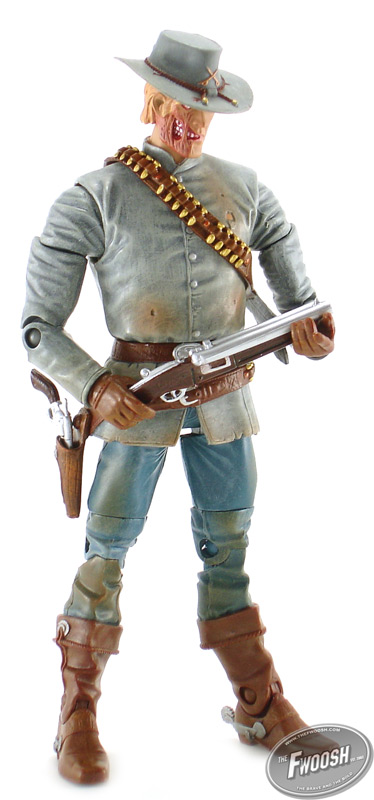 ![]() Next in the DCUC Wave 16 pictoral updates is a figure that may stary from the Batman theme of the wave, but is perhaps one of the most anticipated figures in the entire line - Jonah Hex.... He features a beautifully sculpted face done by the Four Horsemen and features some interesting gun accessories. According to Mattel and TheFwoosh, the reason Hex was chosen for the line was to give fan's of the comic something positive to look forward to after the horrid film from this past summer. |
