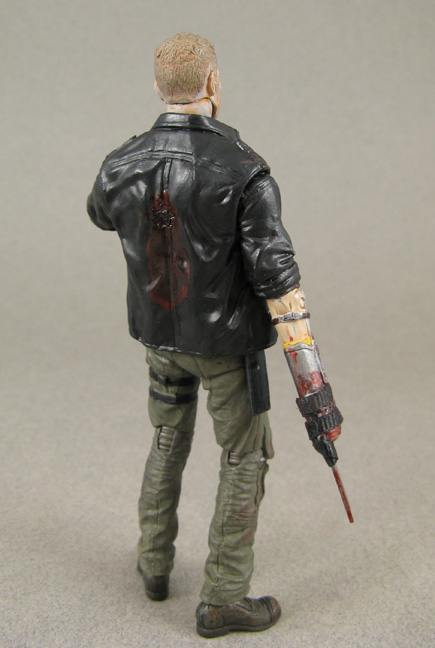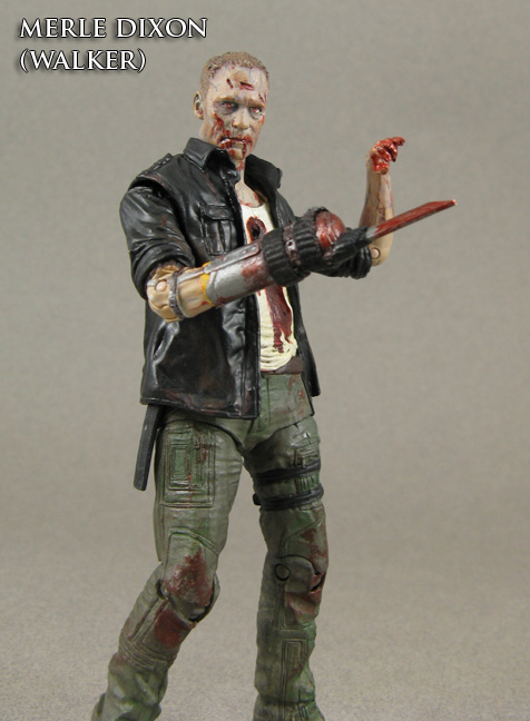 With the 3rd season of The Walking Dead over it's no surprise by now that Merle Dixon didn't make it. He gave a valiant effort towards the end but was shot by the Governor and turned into a walker. Here I took the regular release Merle and removed the two bitten-off fingers from his left hand, replaced the bayonet with a real metal spike belted on, and went about removing pouches/filling the peg holes. The bullet hole in his chest and exit wound in his back were sculpted on and was a dangling piece of meat on his lip. One zombied-up paint job later that included the grey veins, wet bloody look, and Merle was ready for his final act.