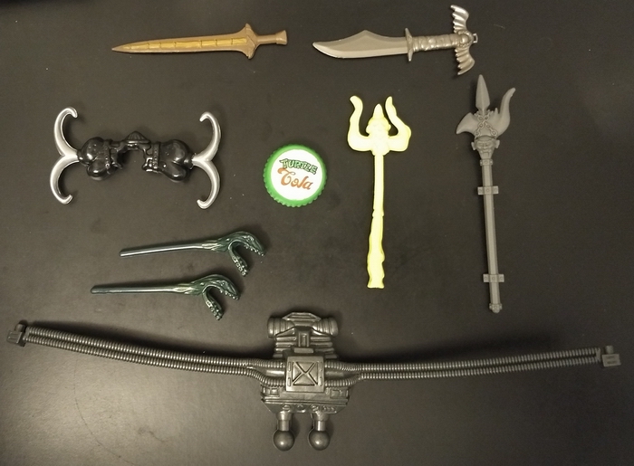 ![]() Had some updates from some helpful collectors. The cap was a vintage Headdroppin' Raph (TMNT), the spear was from the Kenner Gargoyles line and the sword with batwings was from a Small Soldiers Archer toy. Still have quite a few to go.... the backpack with hoses is driving me nuts, lol! |