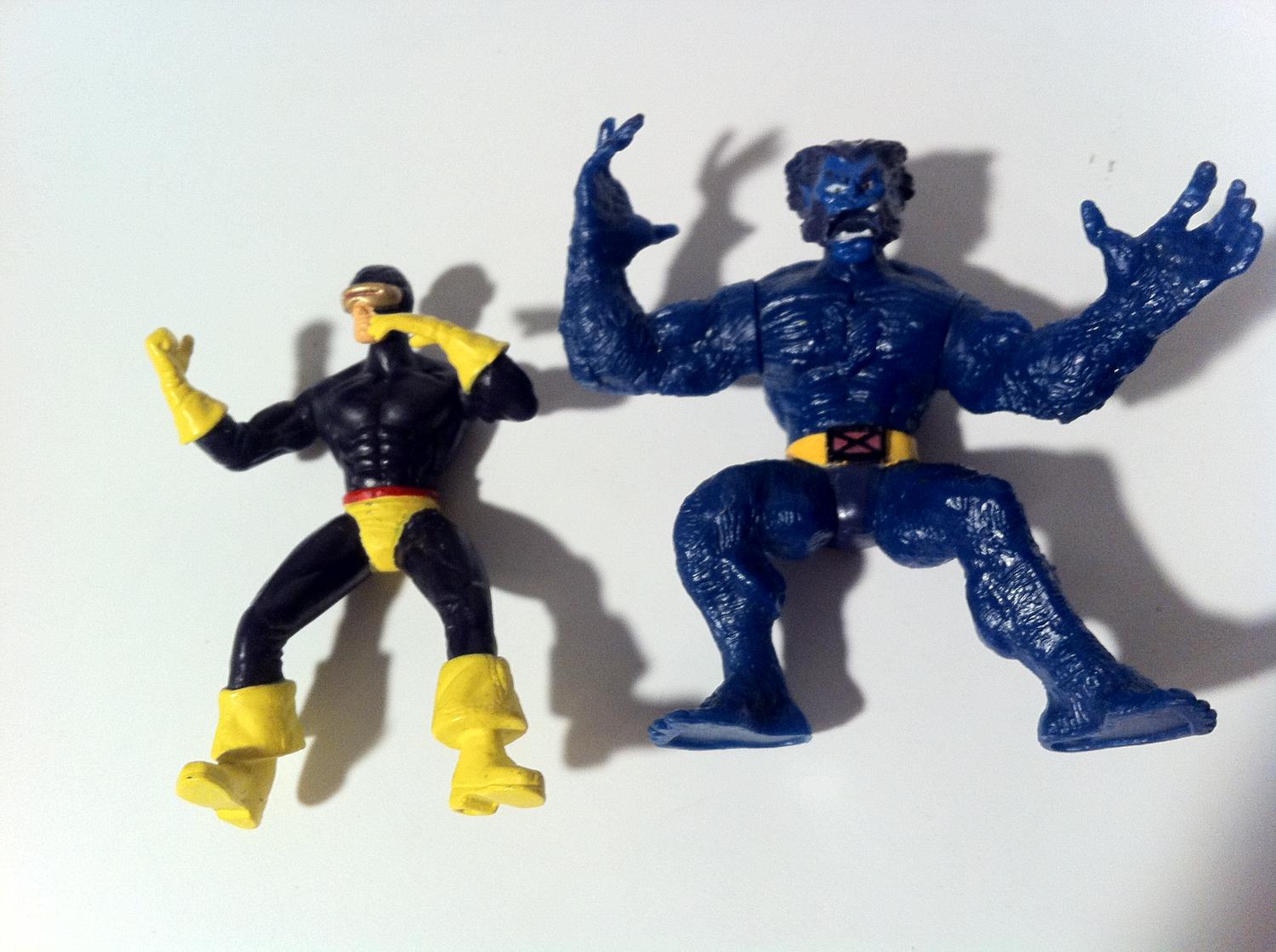 Cyclops is exactly 2" Beast is approx 2.25" Cyclops does have a stamp on his leg I think it is from 06 but it is too small for me to see it clearly. Beast has no stamping or identifiable markings anywhere Thanks for helping |