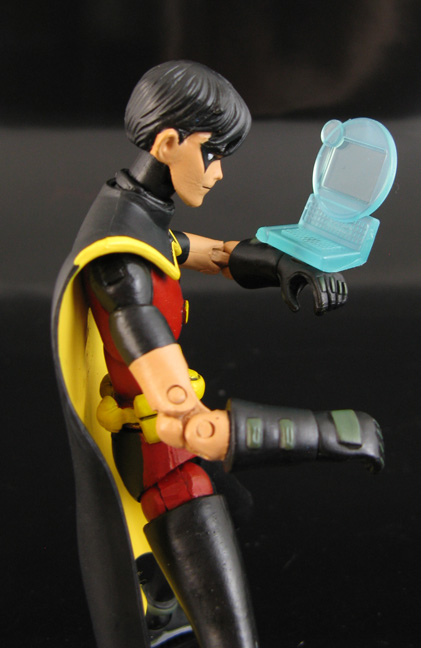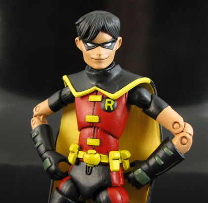 If you're familiar with the Young Justice deluxe Robin figure that came out in stores they used a buffed up body that made him look downright bizarre. Here I've changed that by swapping out the entire body using a Marvel legends X-23 figure. The original Robin's head, hands, lower legs, and cape/belt were grafted on and joints were modded for better range of articulation. X-23 had to have a 'chest reduction' in order for this to work but once it did we finally have a smaller Robin that looks like the cartoon art!